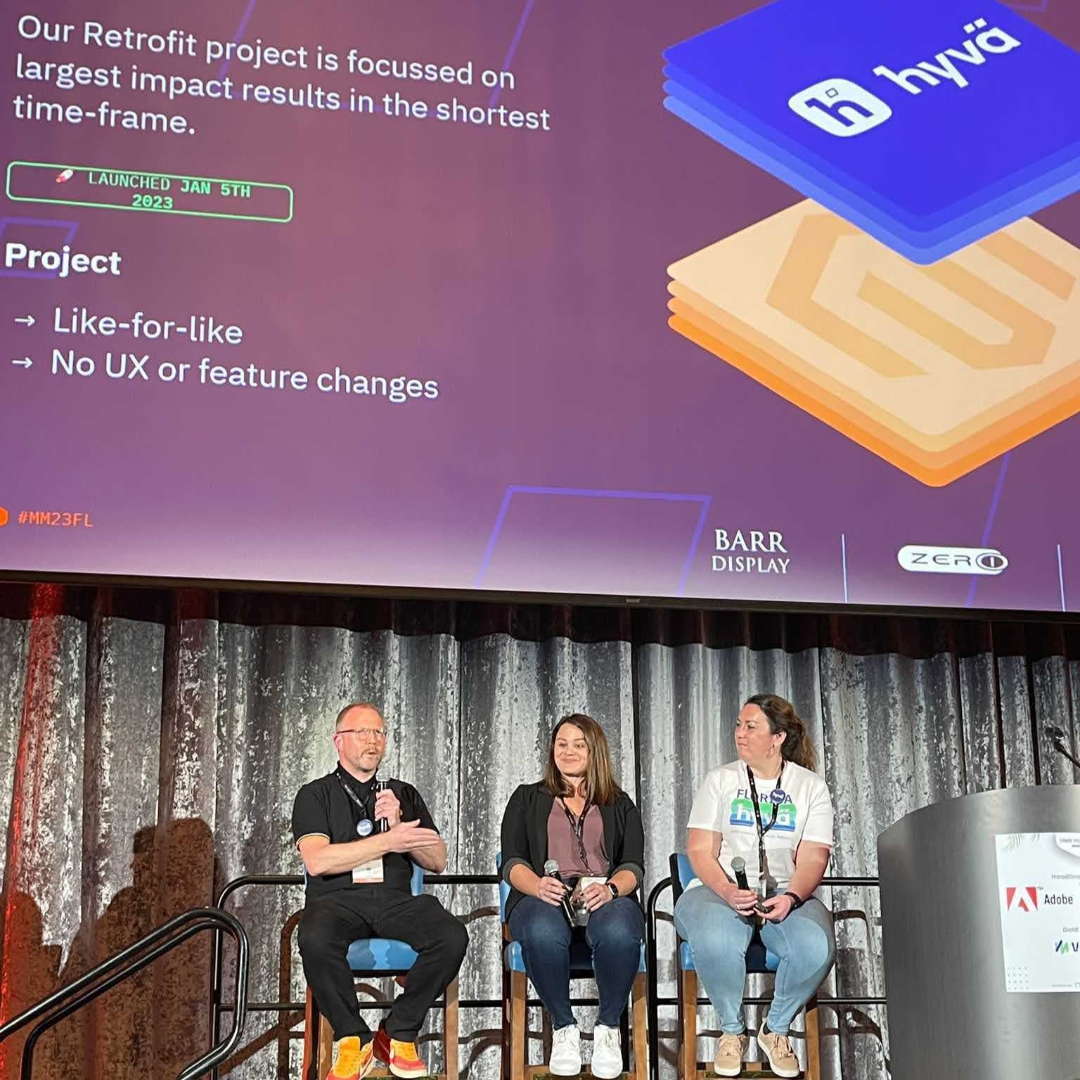 We coined the phrase 'retrofit' where Hyvä was concerned, pioneering a method to implement the stack in the most effective manner. Since our talk in early 2023 (pictured right) we have implemented over 25 further projects and are on course to hit 35 by summer 2024.